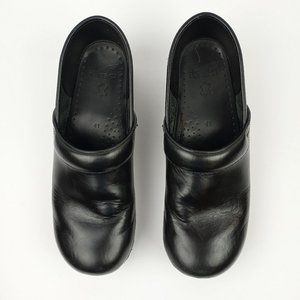 Dansko Black Leather Clogs Size Eur 41 USA 10.5- 11. Dansko black leather all day wear "nursing shoes". Durable, slip on, comfort slip resistance career wear clogs. Preowned with some light signs of wear: scuff marks and wear on the piping which is common for these shoes. Please see pictures for approximate measurements.