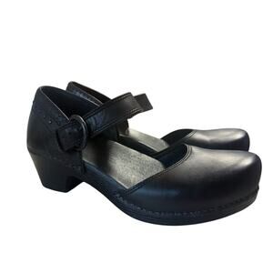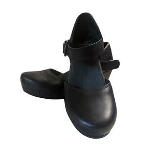Elegant black leather clogs. Secure strap closure. Comfortable low heel.