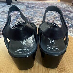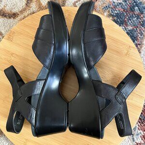 Black leather platform wedge sandal made by Dansko exclusively for The Walking Company. Very good condition!