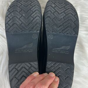 Dansko Black Patent Leather Professional Petrol Clogs in size US 8 or European 38. Good preowned condition. A few scuff but sole is barely worn. Plenty of life left!