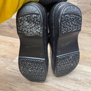 Dansko Elegant black clogs with intricate pattern. Comfortable and stylish for everyday wear. Size 42. Pre-loved.