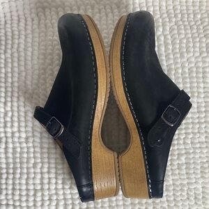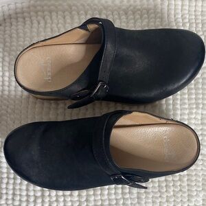 Chic black suede mules. Features a stylish side buckle. Easy slip-on design.