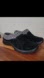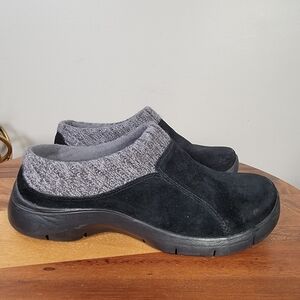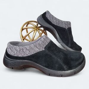 Comfortable slip-on clogs in black and gray. Blacu suede uppers with a gray sweater knit style collar. Comfortable footbed. Easy all day casual or work wear. Slip resistant bottoms.