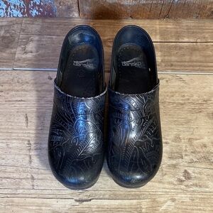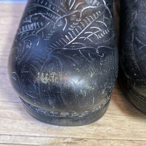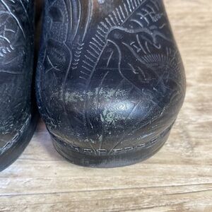Here is a fun pair of Dansko Black Tooled Leather Clogs size 38 in good used condition with signs of wear like scuffs on leather and wear on edges as shown in close up pictures.