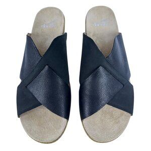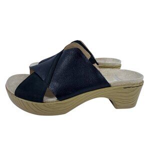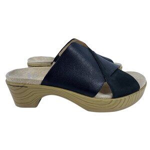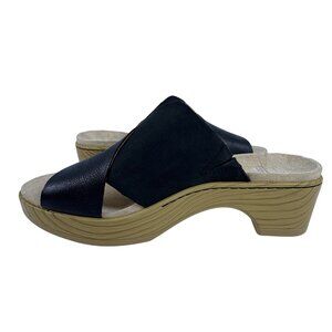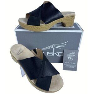 Stylish Dansko sandals with a black crisscross design. Comfortable tan sole. Perfect for casual wear.