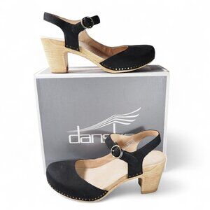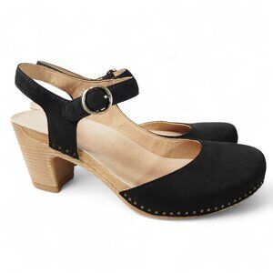 Stylish Dansko sandals with a black upper and tan heel. Comfortable and chic design. Perfect for any occasion. I love these - I just have really wide feet and they are a bit too narrow for me. Excellent like new condition.