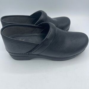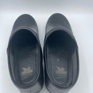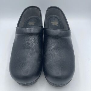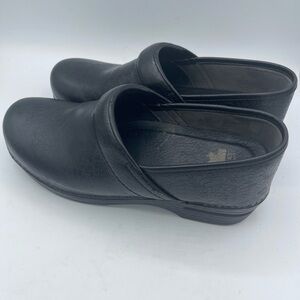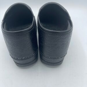 Dansko Black floral Embossed Clogs Womens Size 41 (10.5-11) Leather Tooled Floral. Round toe. Professional shoes. Some peeling on sides…see picture. Very good preowned condition.