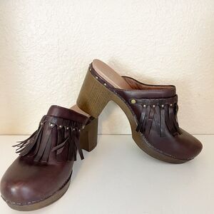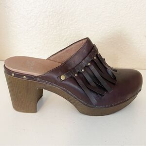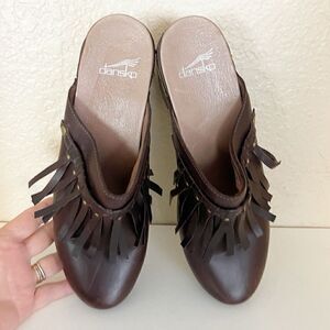 Dansko Brown Deni Heeled Clog Mules Fringe Slip On. 41/10-10.5