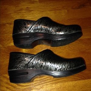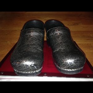Dansko black and silver Clogs. Very good used condition. Very slight wear at heels see picture of soles.