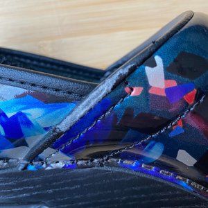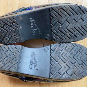 Dansko Clogs in size 38. Gently used. Beautiful multicolor with black background. The left clog has a small area of distressing as noted in picture #4.
