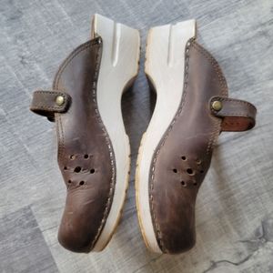Beautiful Leather Clogs have cut out design by the toes. Adjustable strap. 2" heel Excellent condition.