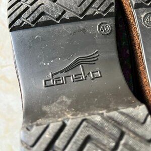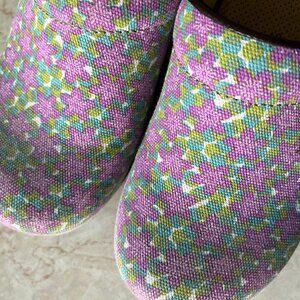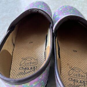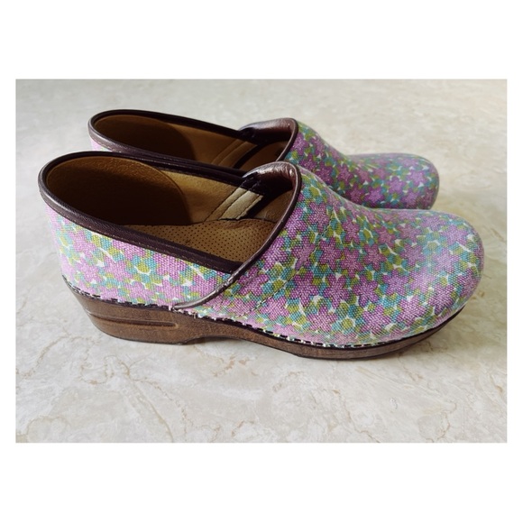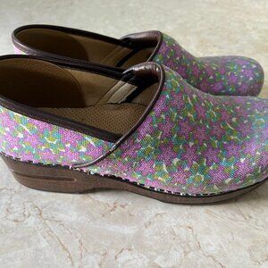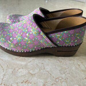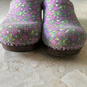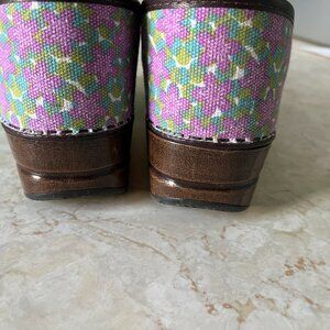 Cute vegan clogs by Dansko in women's size 40 or US sz 9.5. Purple and green canvas floral upper with brown faux leather trim. Fabric interior with molded, cushioned, footbed. Brown wood look platform sole and rubber outsole. Very light wear on interior and outsole. Upper is clean and in good condition.