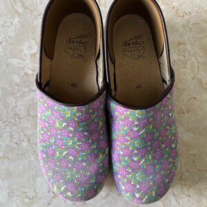 Dansko Clogs Sz 40 Vegan Floral Canvas Design with Brown Trim and Heel