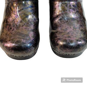 Dansko Clogs Womens 41 Black Patent Leather Scribble Pattern Professional Shoes