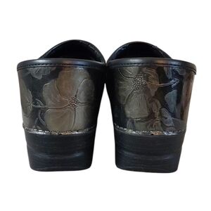 Step into a world of vibrant style with Dansko's black and green clogs, featuring a unique artistic leaf pattern. These mules boast a rounded toe and a slightly raised heel, offering both comfort and a classic silhouette. The glossy, iridescent finish adds a shimmering touch to any outfit.