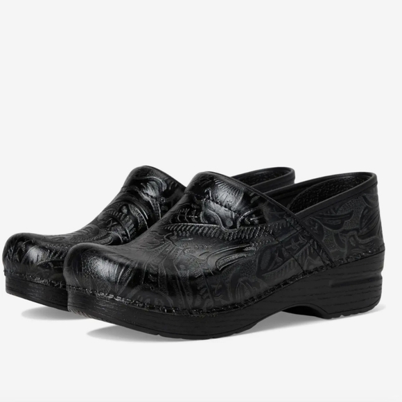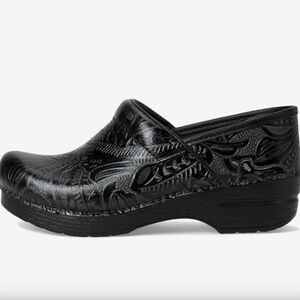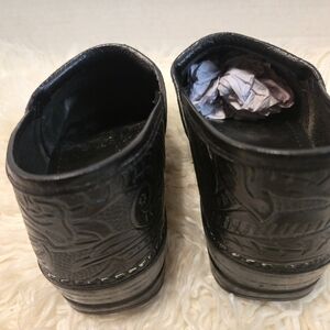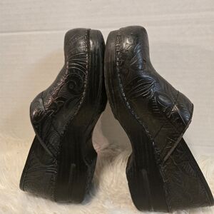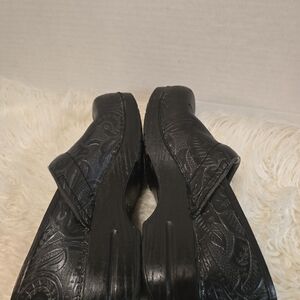 Stylish black clogs with embossed design. Comfortable and chic. Preloved conditions smoke-free home cleaned and sanitized size 40