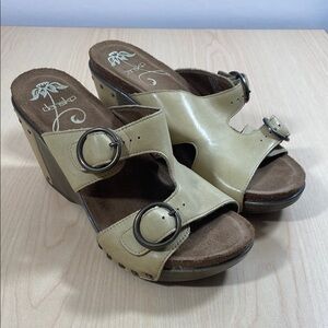Step into comfort and style with Dansko's khaki and brown wedges, featuring a supportive cork-like wedge heel and a contoured footbed. These shoes are perfect for everyday wear, offering a blend of elegance and practicality. The slip-on design with wide straps ensures a secure fit, making them a versatile addition to any wardrobe.