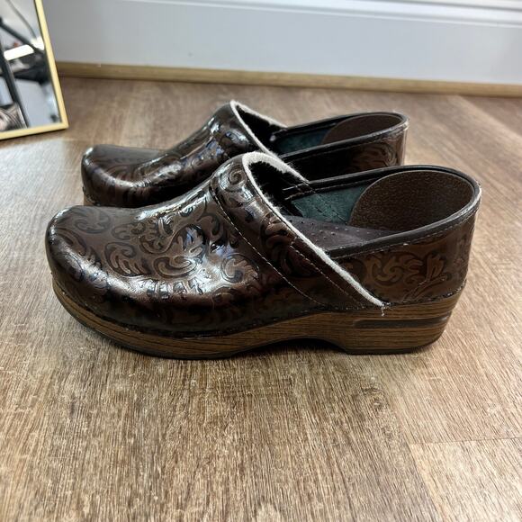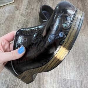 Dansko Filigree Floral Brown Leather Patent Comfort Clogs