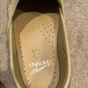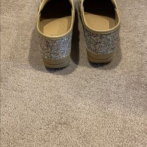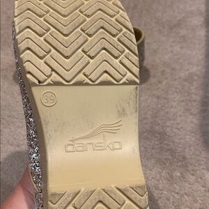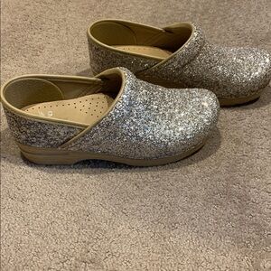 Stylish clogs with a beige base and silver accents. These are in excellent condition and we’re only worn a couple of times for an event.