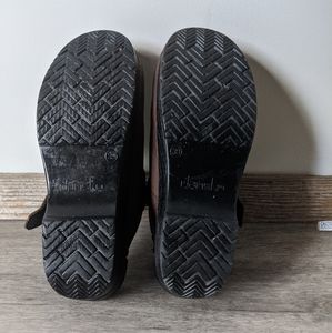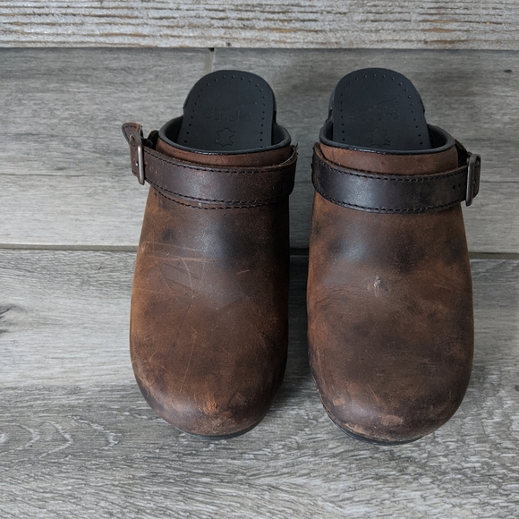 Size 39 (~8.5-9) dansko clogs. Slip on with adjustable heel strap. Some mild scuffing on the toes and upper of both shoes, but soles are in very good condition. They are made with high quality leather and have lots of life left in them. Insole length 10"