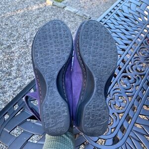 Dansko Lulu Wedge in purple suede European size 37 (US Size 6.5-7). It has an adjustable ankle straps adding a bold retro-inspired style. It has removable open cell polyurethane footbed with foam in the forepart and heel providing all day comfort. The textured rubber outsole is good for traction. In great condition!