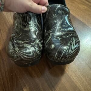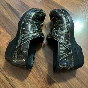 Dansko Marbled Pattern Professional Nursing Clogs in women's Size 41 / US 10.5 - 11. Roomy toe box. Shiny leather, pleather look. Shoes have some peeling around the front edge of where you slide your foot in, but otherwise are in very good used condition with minor signs of wear. Please see close-up pictures for condition details.