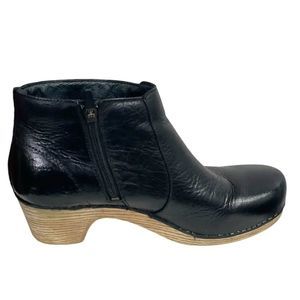 Dansko Maria Black Bootie Leather Heeled Ankle Boot with light tan colored heel.