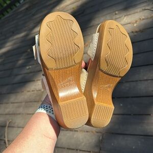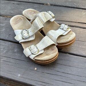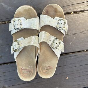 Stylish white sandals featuring double straps and buckle accents. Perfect for casual wear.