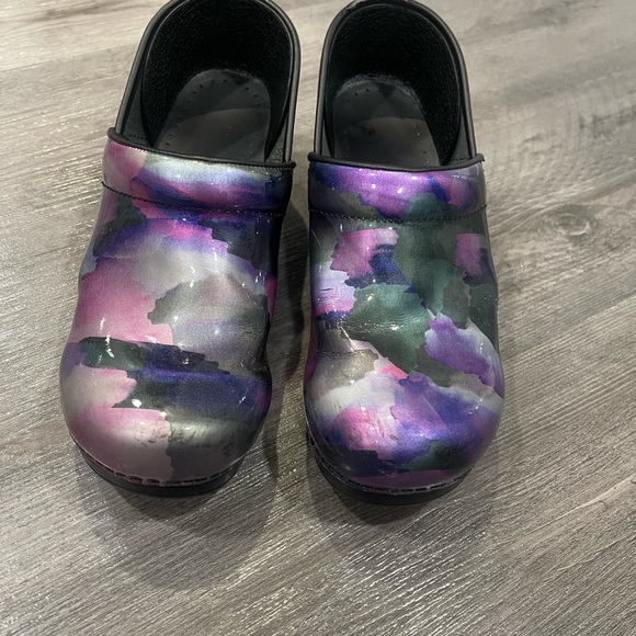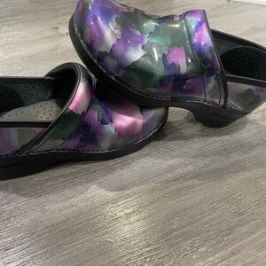 Stylish Dansko clogs with a vibrant multicolor design. Comfortable and durable. Perfect for everyday wear.