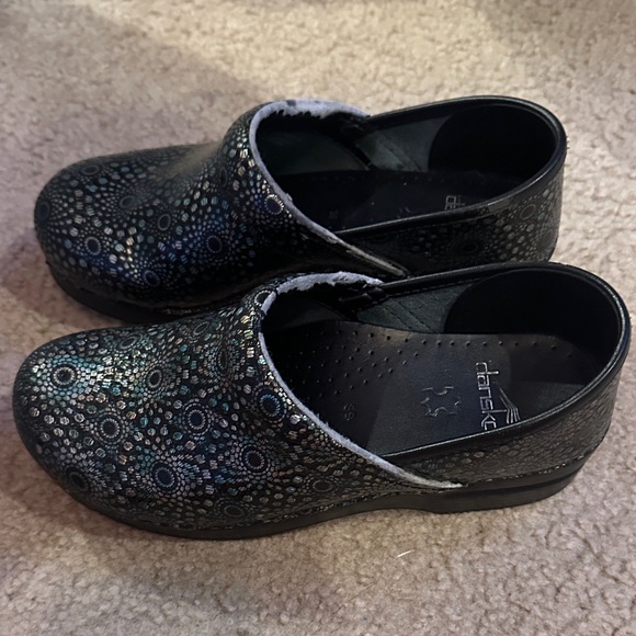 Stylish Dansko clogs with a vibrant multicolor pattern. Comfortable and durable design. A bit worn at the seams (check pictures) but plenty of life left in them!