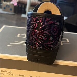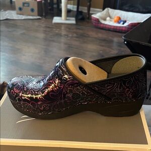 Vibrant clogs with intricate multicolor pattern. Comfortable and stylish design. Perfect for everyday wear.