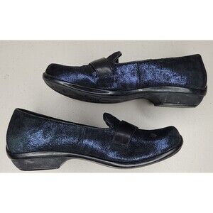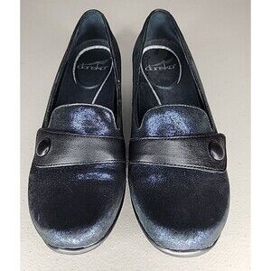 Dansko Olena Women’s 36 Black Leather Blue Metallic Loafer Clogs Flats EUC