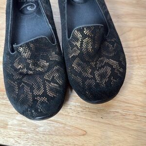 Dansko, Olivia, flats, loafers, clogs, black, bronze, snake-print, leather, size 38, US 7.5-8, comfortable, cushioned, slip-on, stylish, casual, work shoes, durable.
