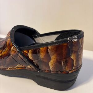 Dansko Patent Leather Clogs Embossed in Brown and Gold Tigers Eye Snake Print and Womens Shoe Size 39 US 8.5. Gently used and in good condition with some minor scuffs (see last three pictures).