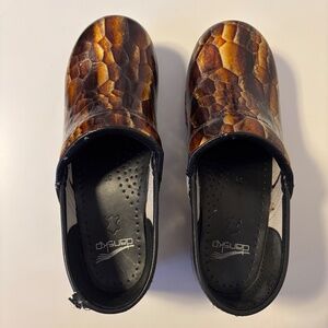 Dansko Patent Leather Clogs Embossed Brown Gold Tigers Eye Womens Shoe 39 US 8.5