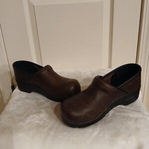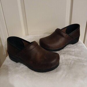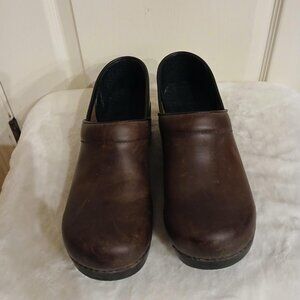 Dansko Professional Antique Brown Oiled Clog in size 41. These are unisex chunky Brown leather clogs in women's 10.5-11 or men's 7.5-8.