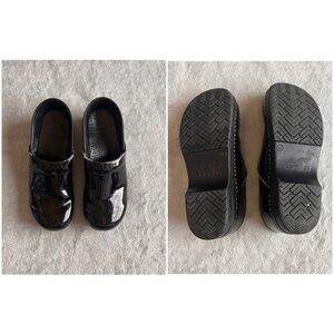 Good-to-fair used condition. Professional Patent Leather Clog by Dansko in solid shiny black leather. Unbeatable comfort & all-day support. Padded instep & roomy toe box, see video. Ideal shoes if you're on your feet a ton, including the healthcare, service or teaching fields. Note: minor signs of wear including peeling at the upper near instep and sides, scuffing and minor creasing to upper, streetwear and scuffing at bottom soles & light wear at insoles, see photos. Size 42, see photos for measurements.