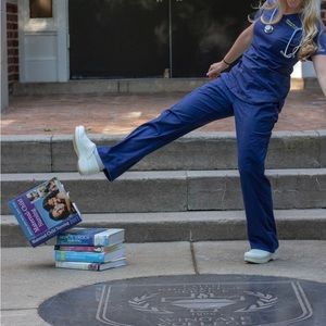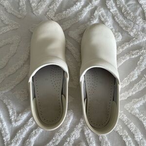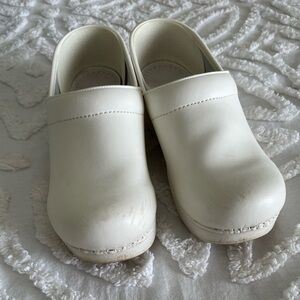 White clogs that were worn for nursing school. Still in great condition, with the exception of some minor scuffs on the front of the shoes. I kept them very clean and wiped them down each time I left the hospital.