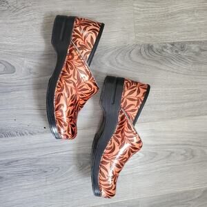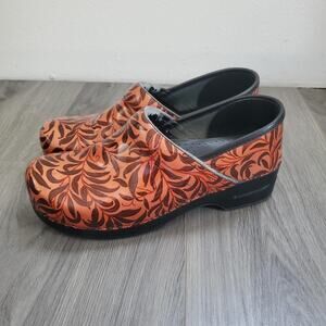 Details: Genuine Dansko Professional closed-back clogs with orange and black floral/vine patent leather upper.