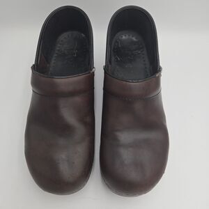 Dansko Professional Clogs in women's size 40 (US 10) are brown leather slip-on work shoes with a round toe and low block heel. Perfect casual or workwear shoes. Please see all photos for condition.