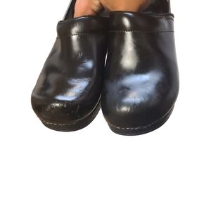 Dansko Professional Women's Black Leather Clogs Size 41. Leather upper  with round toe, cushioned footbed, wedge heel, durable rubber outsoles. Good preowned condition.