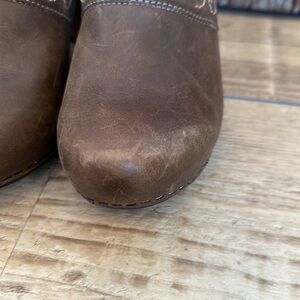 Here is a nice pair of Dansko Rikki Women’s Brown Leather Heeled Clog Size 38 in good used condition with signs of wear as shown.