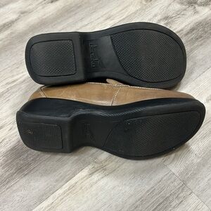 Beautiful comfort slip-on clog shoes from Dansko. Features tan leather uppers with beautiful embroidered detailing.