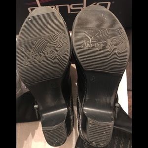 Classic Dansko heeled boots in black leather. Mid-calf shaft with side zipper and buckle detail. Sturdy block heel for stable wear. Clean, simple silhouette for versatile styling.