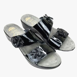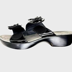 Dansko Euro 40 US 9.5 - 10 Donna Black Patent Leather Flower Slide Sandals Open Toe Hook and Loop Adjustable Straps