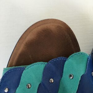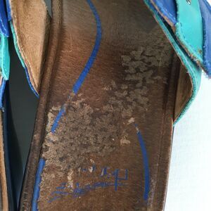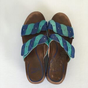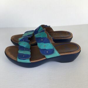 Dansko Dee Leather Slide Sandals Aqua Turquoise/Cobalt Blue. Size 38 EUR/7.5-8 US. There are some minor scuffs on the soles and some peeling and darkening in the footbed. There is some minor color loss to the leather on the straps.