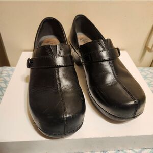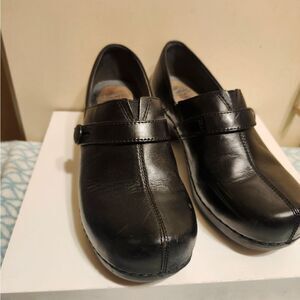 Dansko "Solstice" Black Leather Side Button Closed Back Clogs