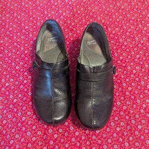 Dansko Solstice Black Leather Clog Shoe Professional Work Career Comfort Orthopedic Scandinavian Button Strap Academia Boho Library Nursing Slip On
