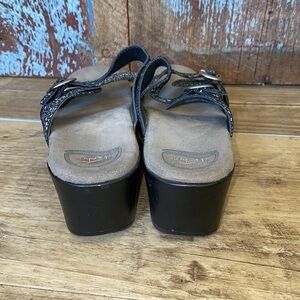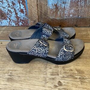 Here is a cute pair of Dansko Sophie Black Shagreen Leather Sandal Slide Black Metallic Women's size 40 in good used condition with minimal signs of wear.
