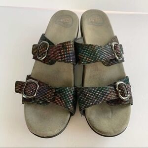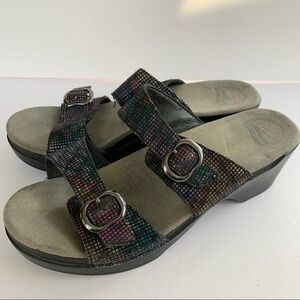 EUC Sophie stained glass holographic rainbow multicolored double strap wedge sandal by Dansko in a size EU42/ US 11.5-12. In excellent used condition. Please see all photos for details.